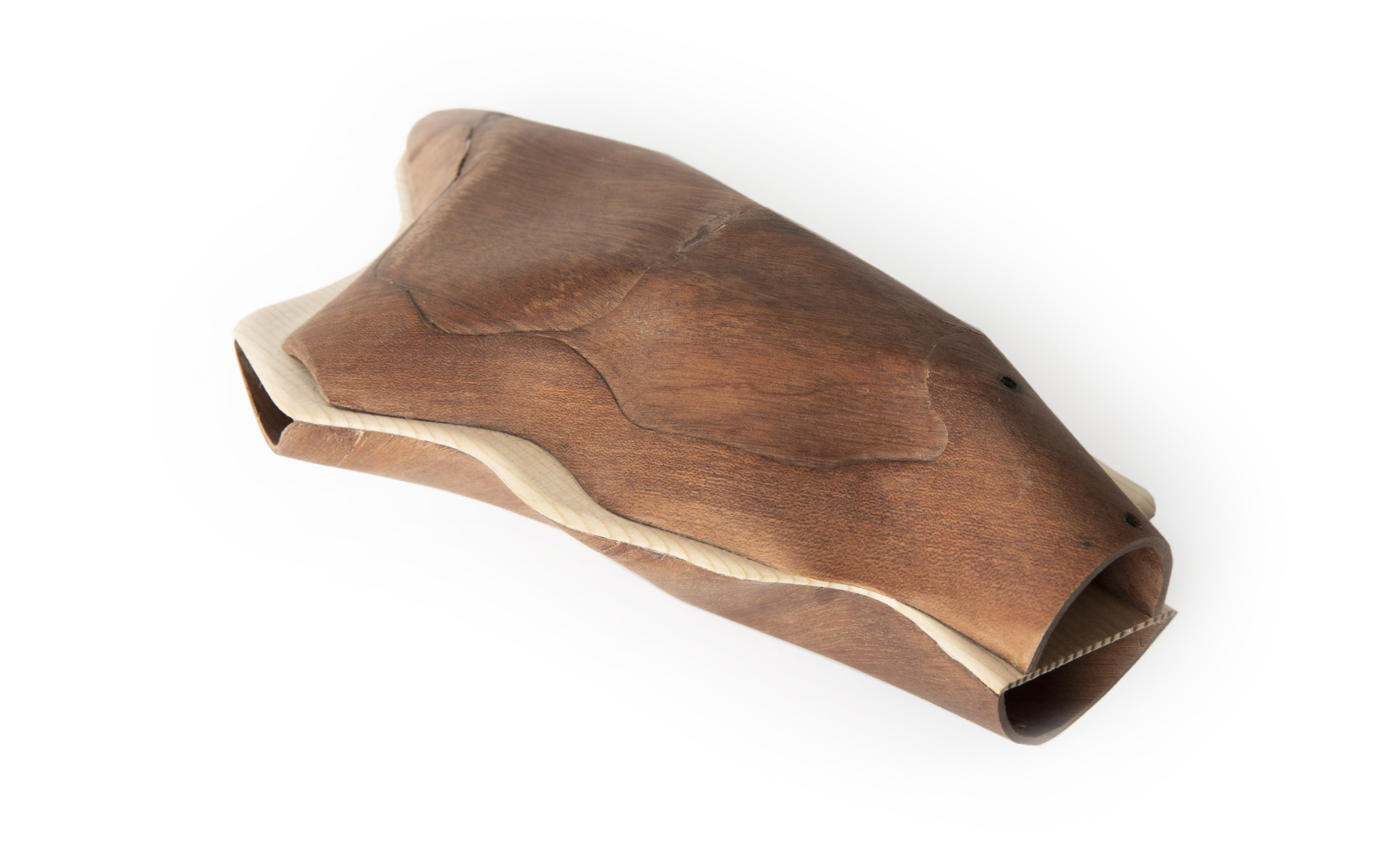instruments (ocarinas). The geometry was simulated by applying gravitional loads to developable mesh patterns, which self-form according to their boundary constraints. The